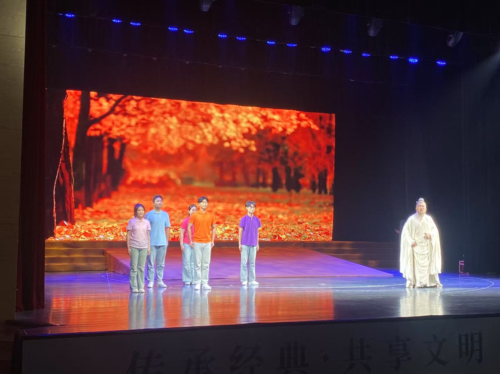 该作品以齐鲁文化为底蕴,融合历史人物与经典思想,通过情景剧与朗诵相结合的创新形式,借助音乐、服装、道具等舞台元素,生动演绎了一场跨越千年的文化对话。作品内容紧扣“齐风鲁韵·阅创华章”的大赛主题,既有文化深度,又具时代气息,展现了山东工业职业学院学子对齐鲁文化的深刻理解与创意表达。